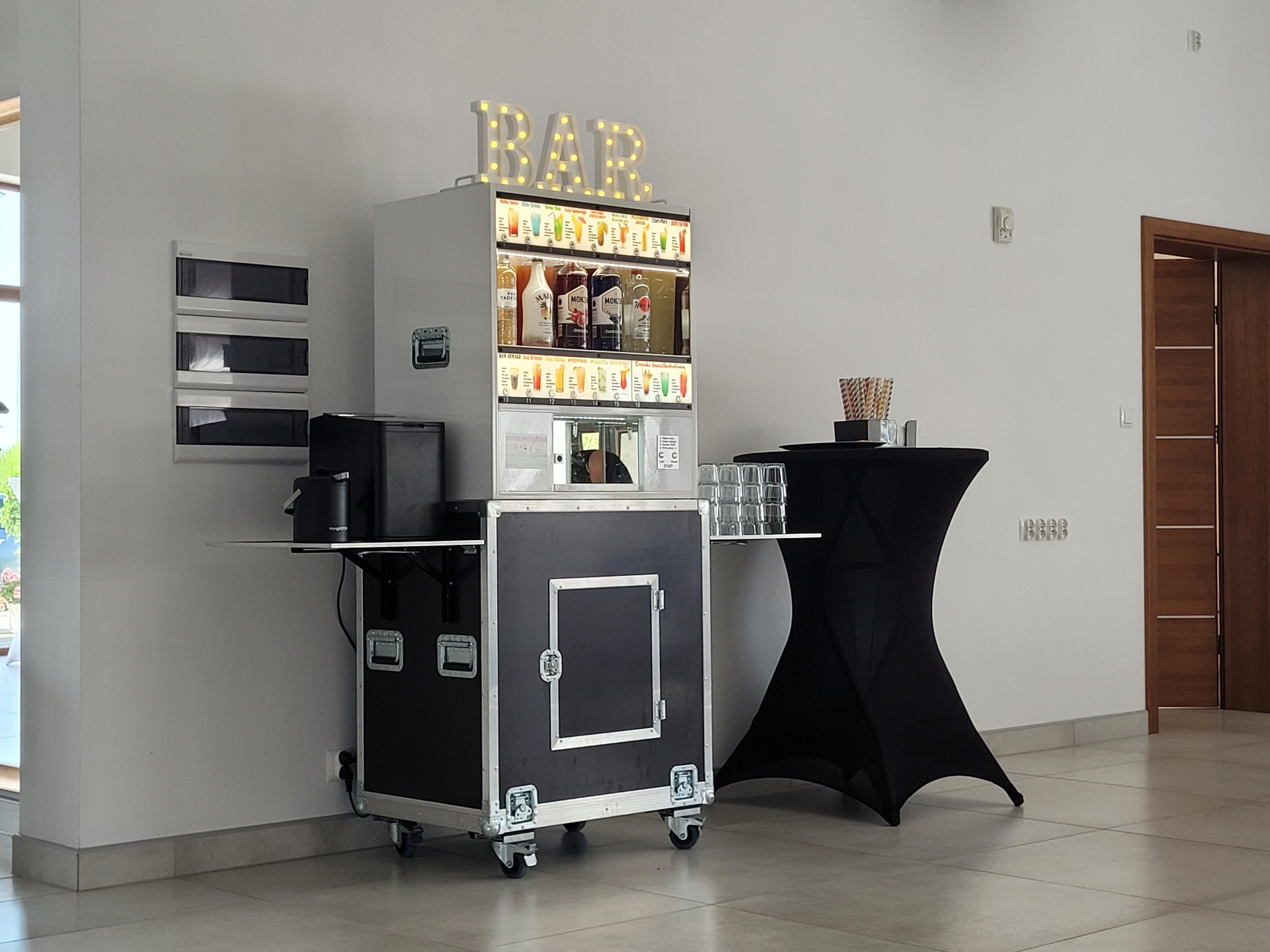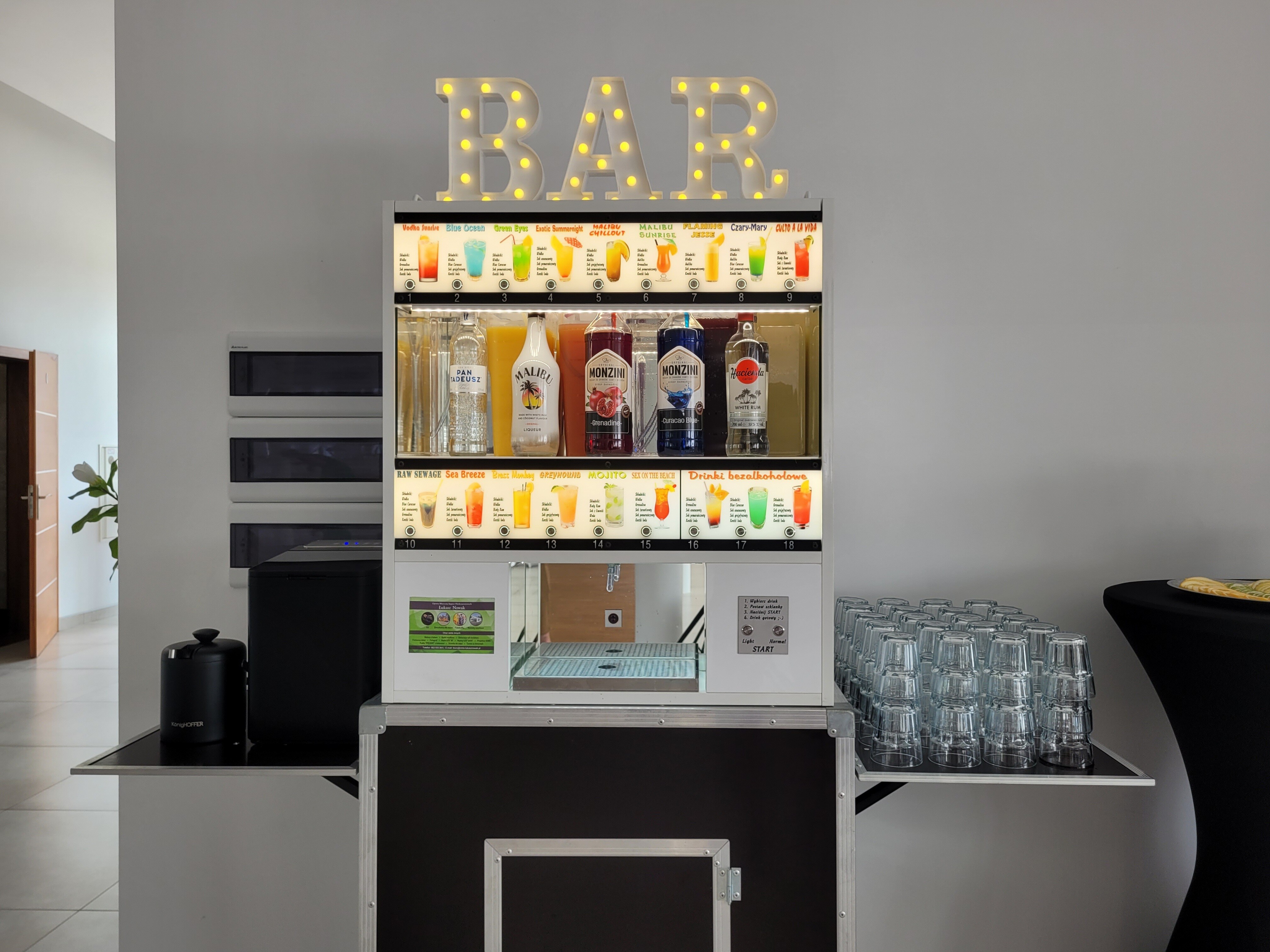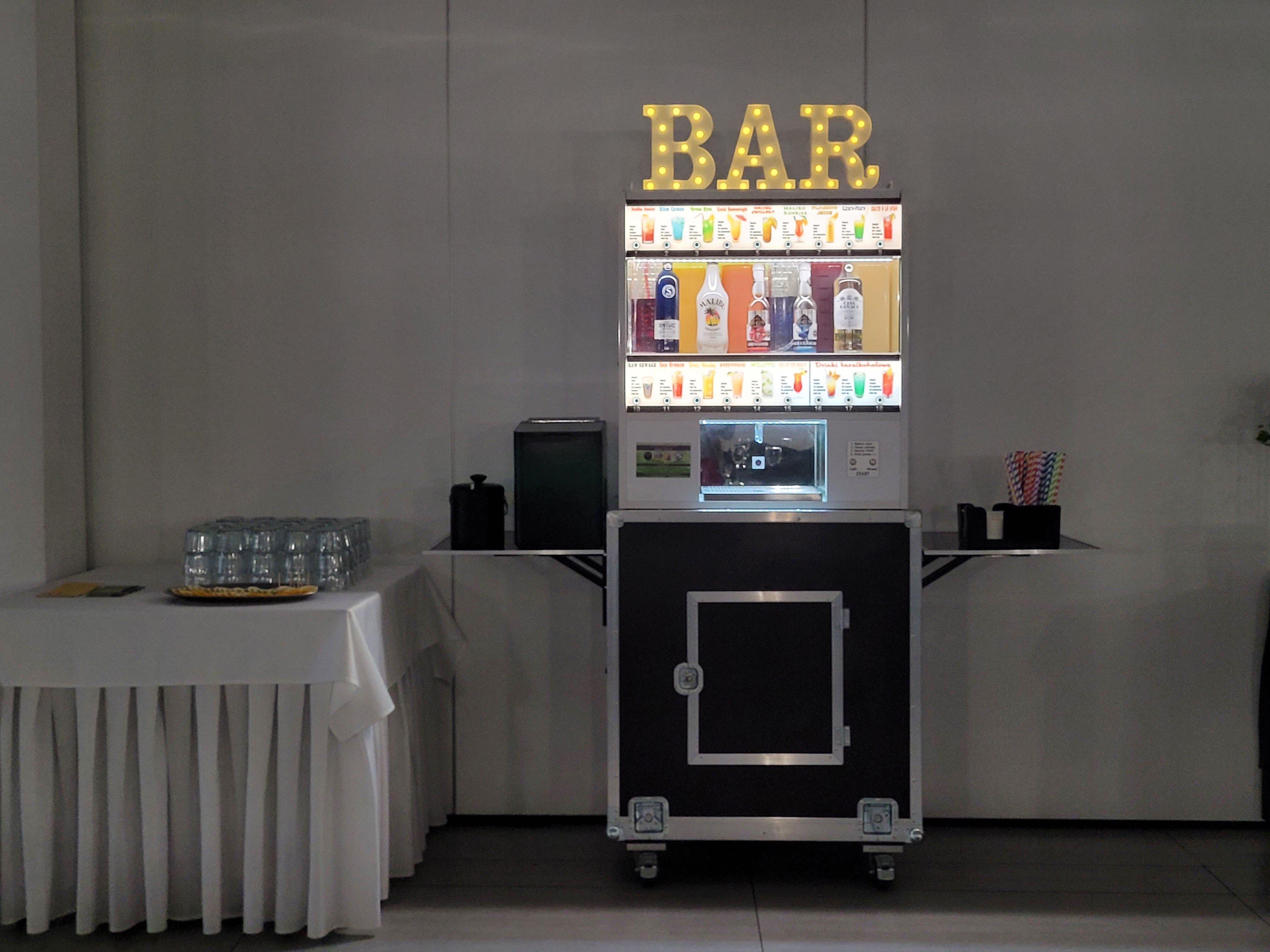 Automatyczny barman to idealna atrakcja na wesele, urodziny, event oraz dowolną imprezę okolicznościową, która zaskoczy wszystkich. Urządzenie posiada 18 różnych drinków do wyboru, w tym 3 bezalkoholowe. Wyjątkowa łatwość obsługi, wystarczy wybrać drinka, położyć szklankę w odpowiednim miejscu i nacisnąć przycisk start.