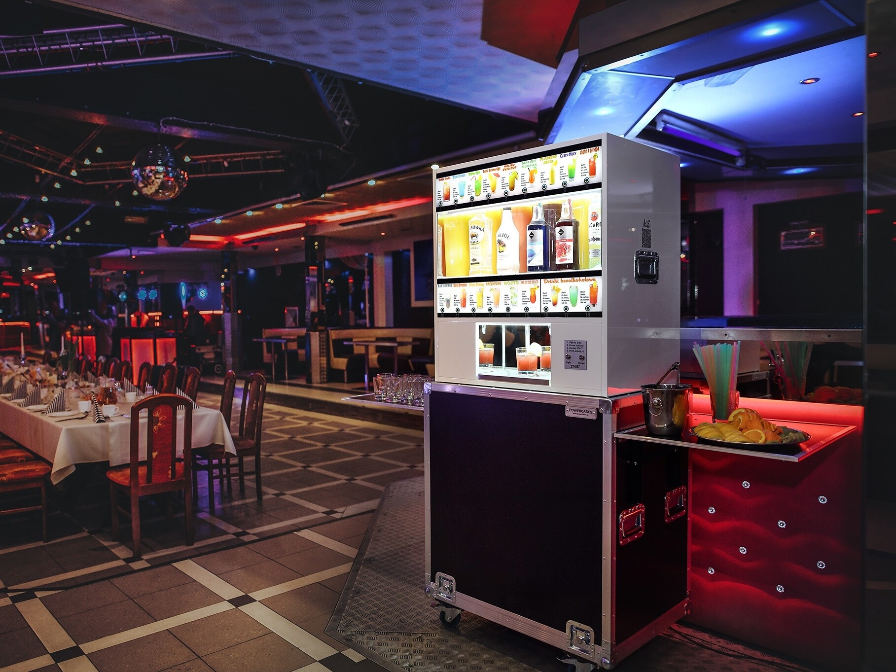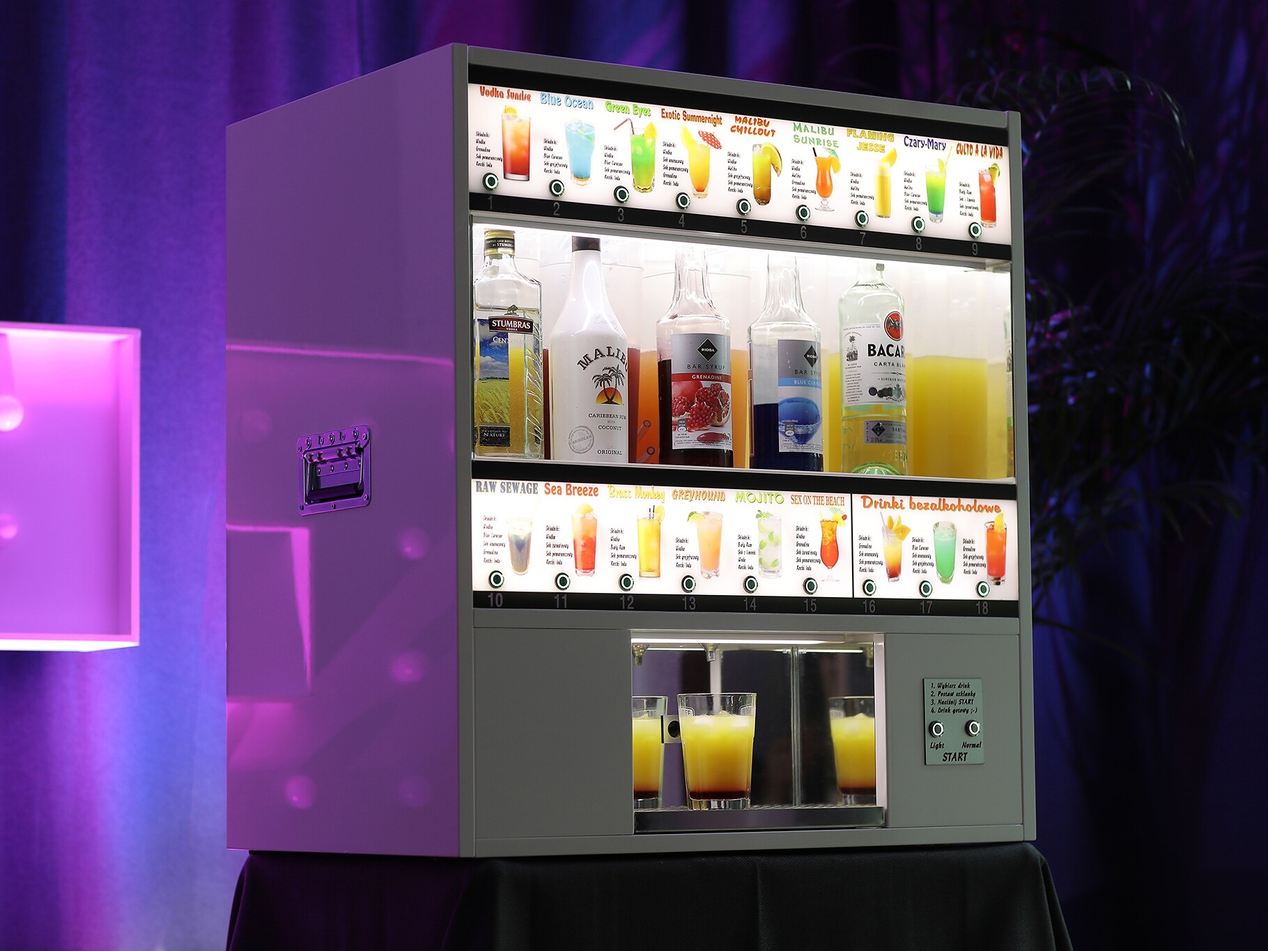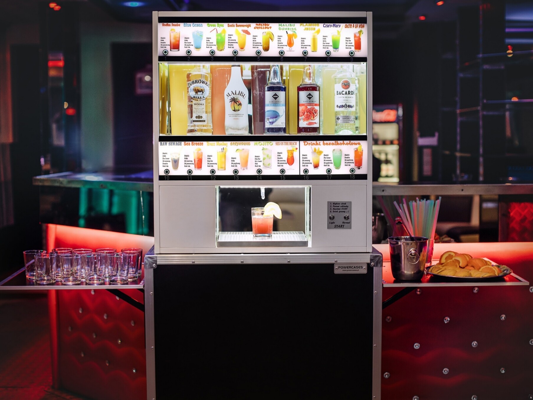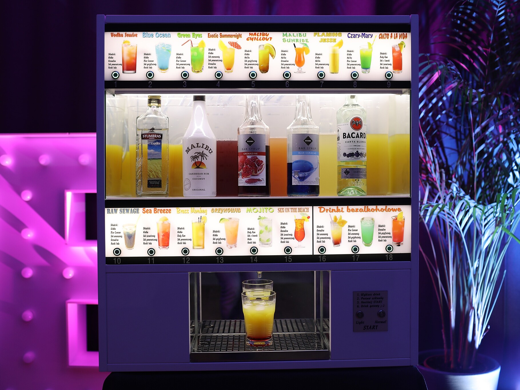 Automatyczny barman to idealna atrakcja na wesele, urodziny, event oraz dowolną imprezę okolicznościową, która zaskoczy wszystkich. Urządzenie posiada 18 różnych drinków do wyboru, w tym 3 bezalkoholowe. Wyjątkowa łatwość obsługi, wystarczy wybrać drinka, położyć szklankę w odpowiednim miejscu i nacisnąć przycisk start.