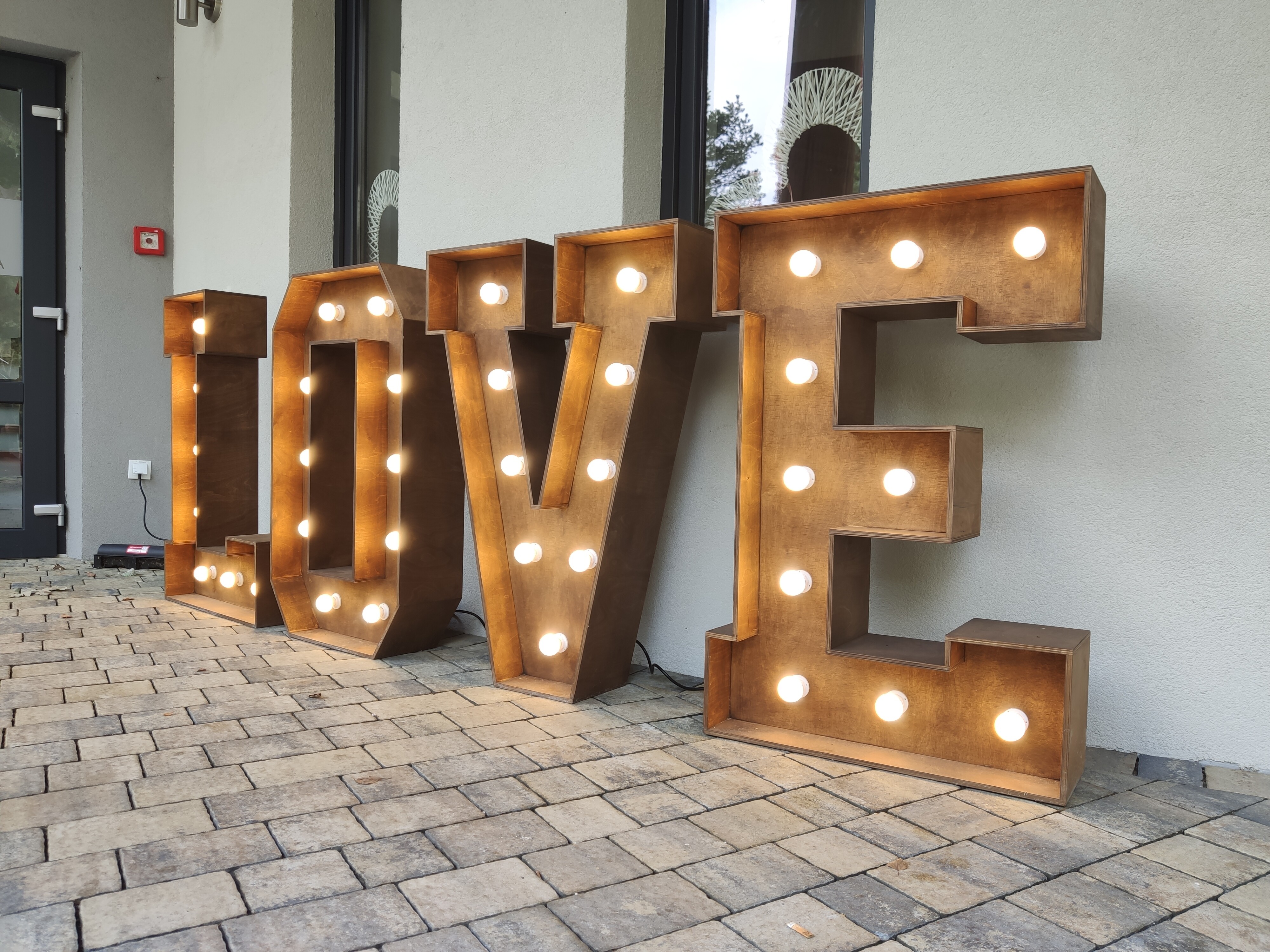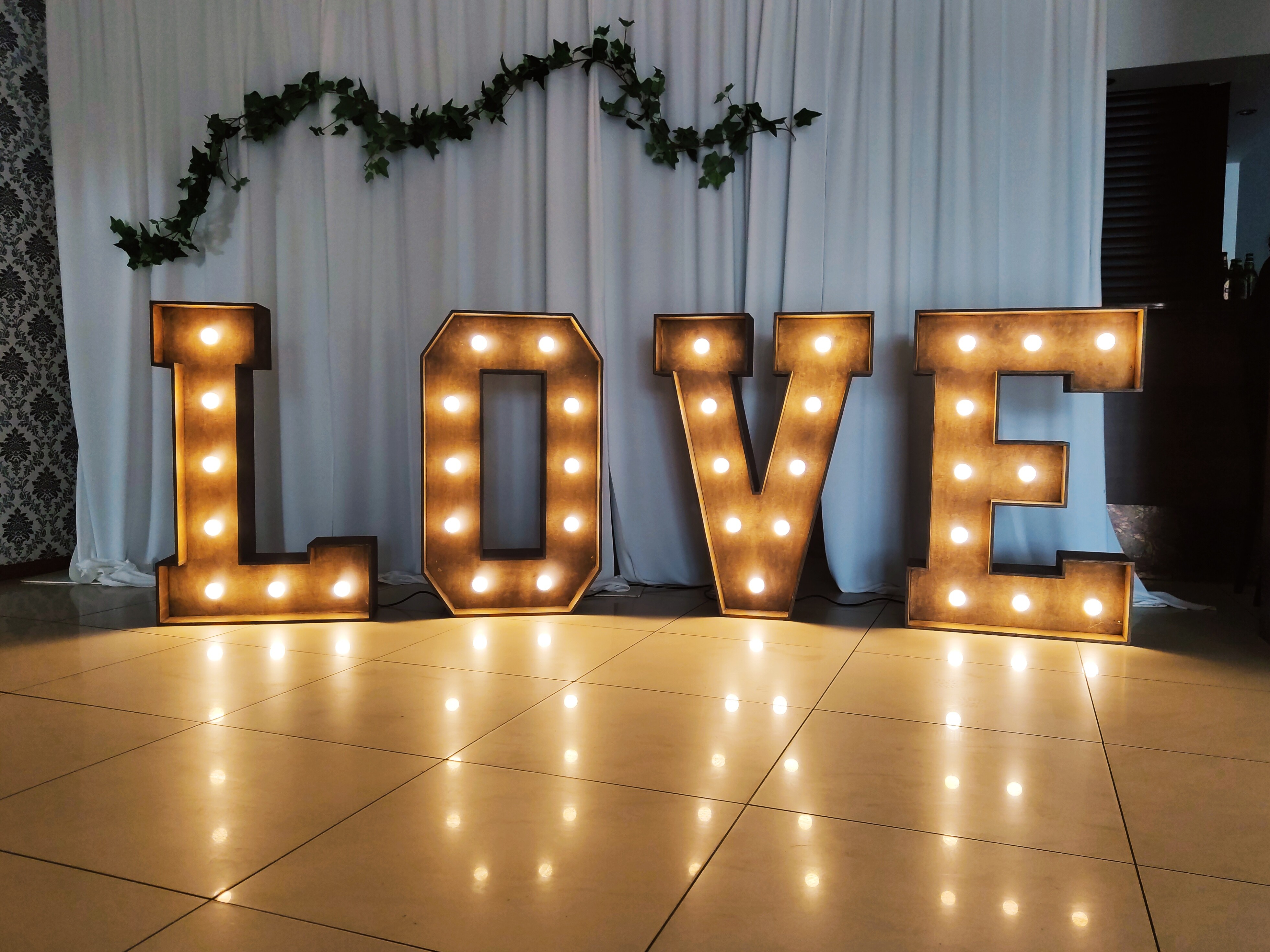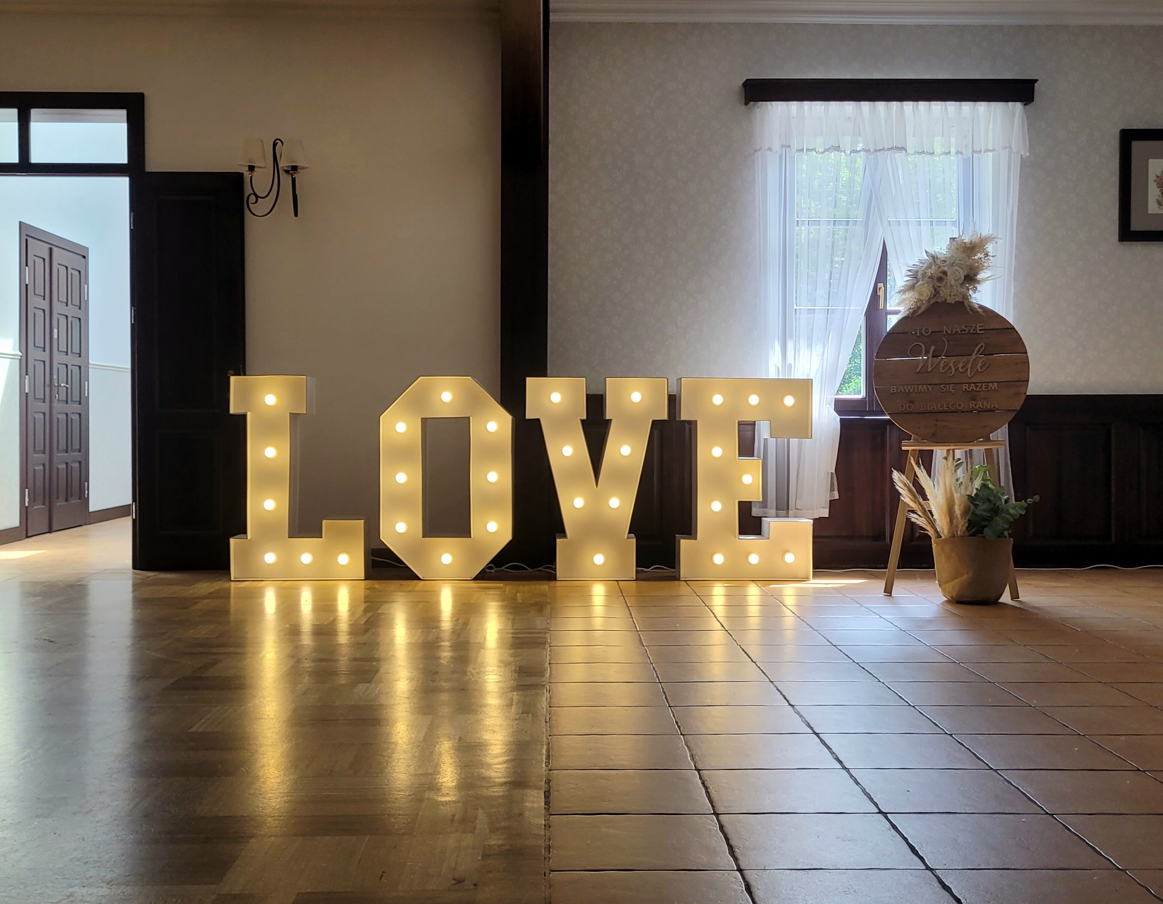 Oferuję Państwu wynajem napisu LED "LOVE" w dwóch kolorach (białym i rustykalnym). Idealnie sprawdzi się na weselu. Oferta zawiera: przywiezienie i ustawienie napisu w dniu imprezy/sesji, zabezpieczenie przed warunkami atmosferycznymi, demontaż i zebranie po imprezie/sesji zdjęciowej.