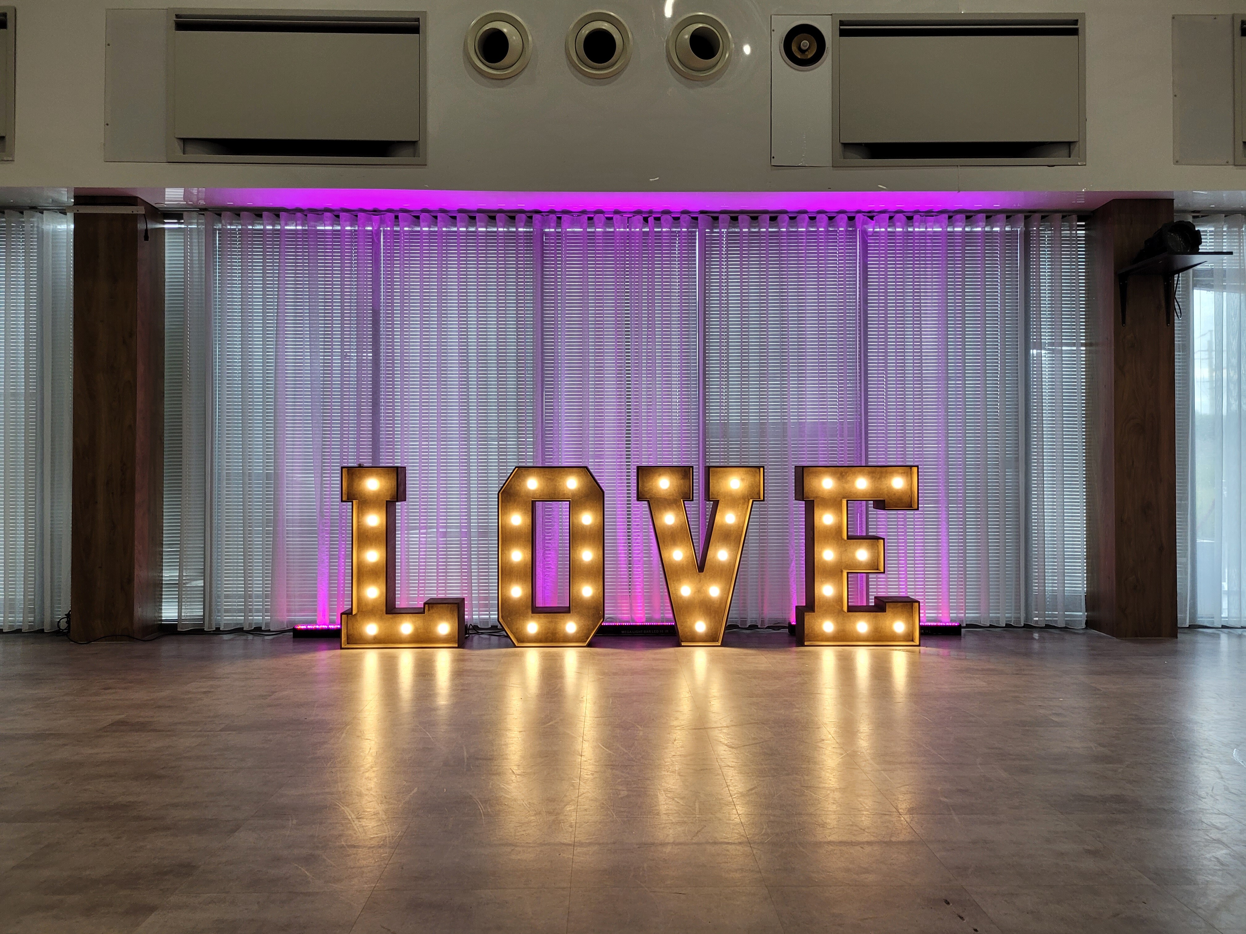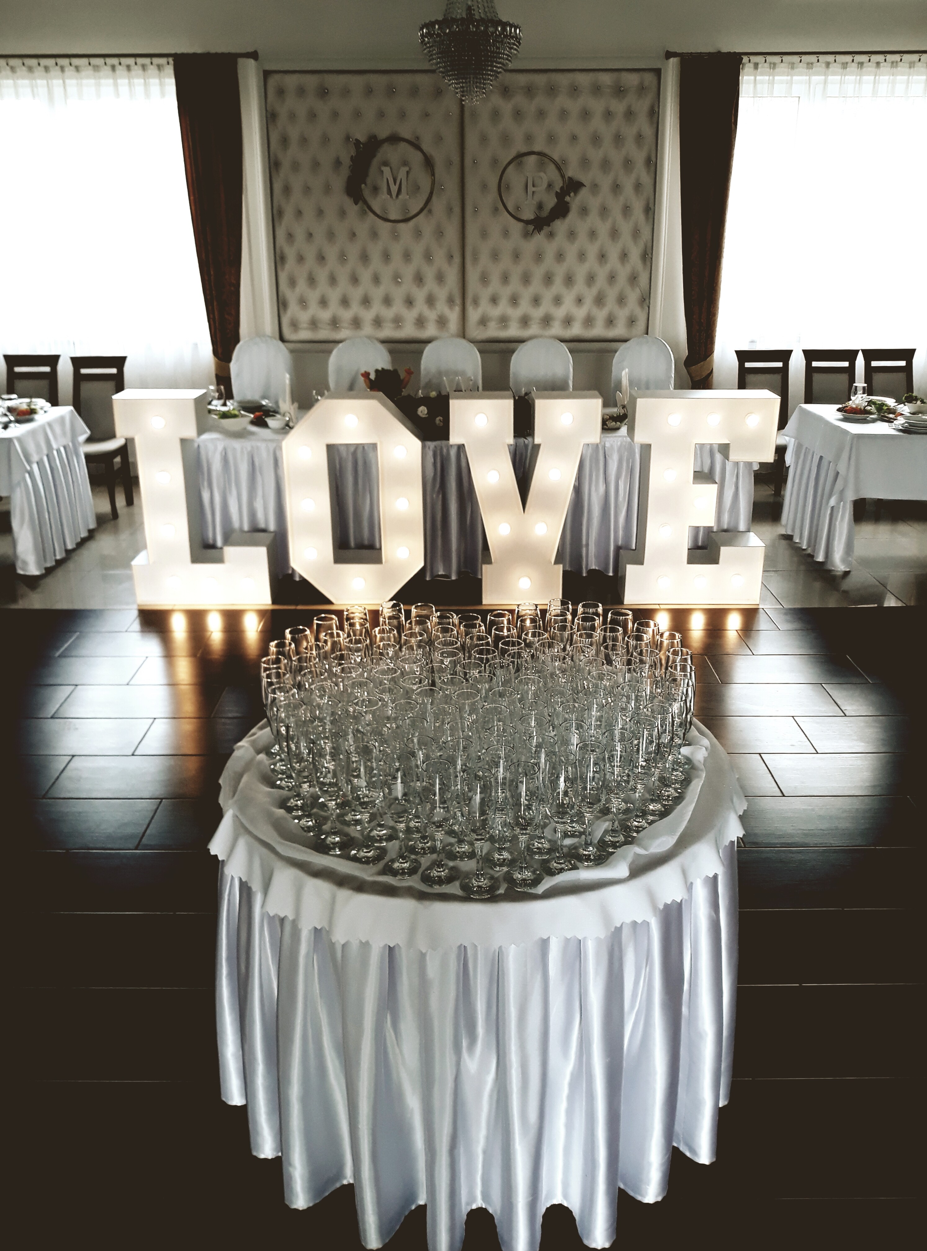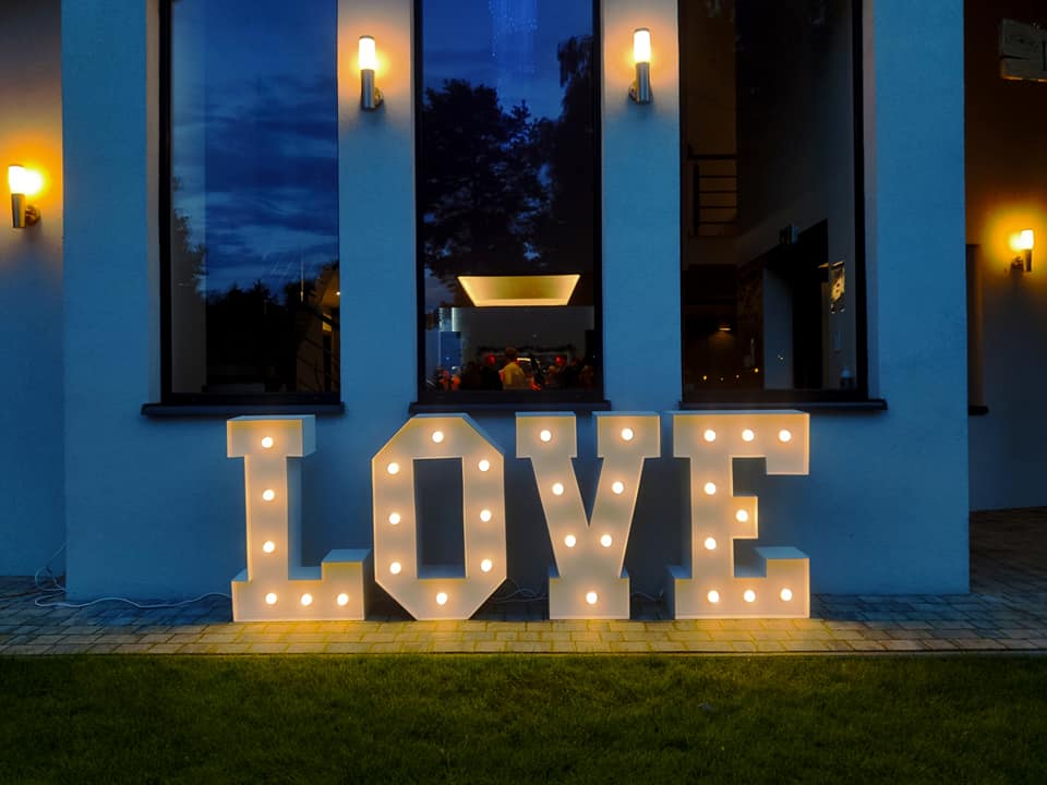 Oferuję Państwu wynajem napisu LED "LOVE" w dwóch kolorach (białym i rustykalnym). Idealnie sprawdzi się na weselu. Oferta zawiera: przywiezienie i ustawienie napisu w dniu imprezy/sesji, zabezpieczenie przed warunkami atmosferycznymi, demontaż i zebranie po imprezie/sesji zdjęciowej.
