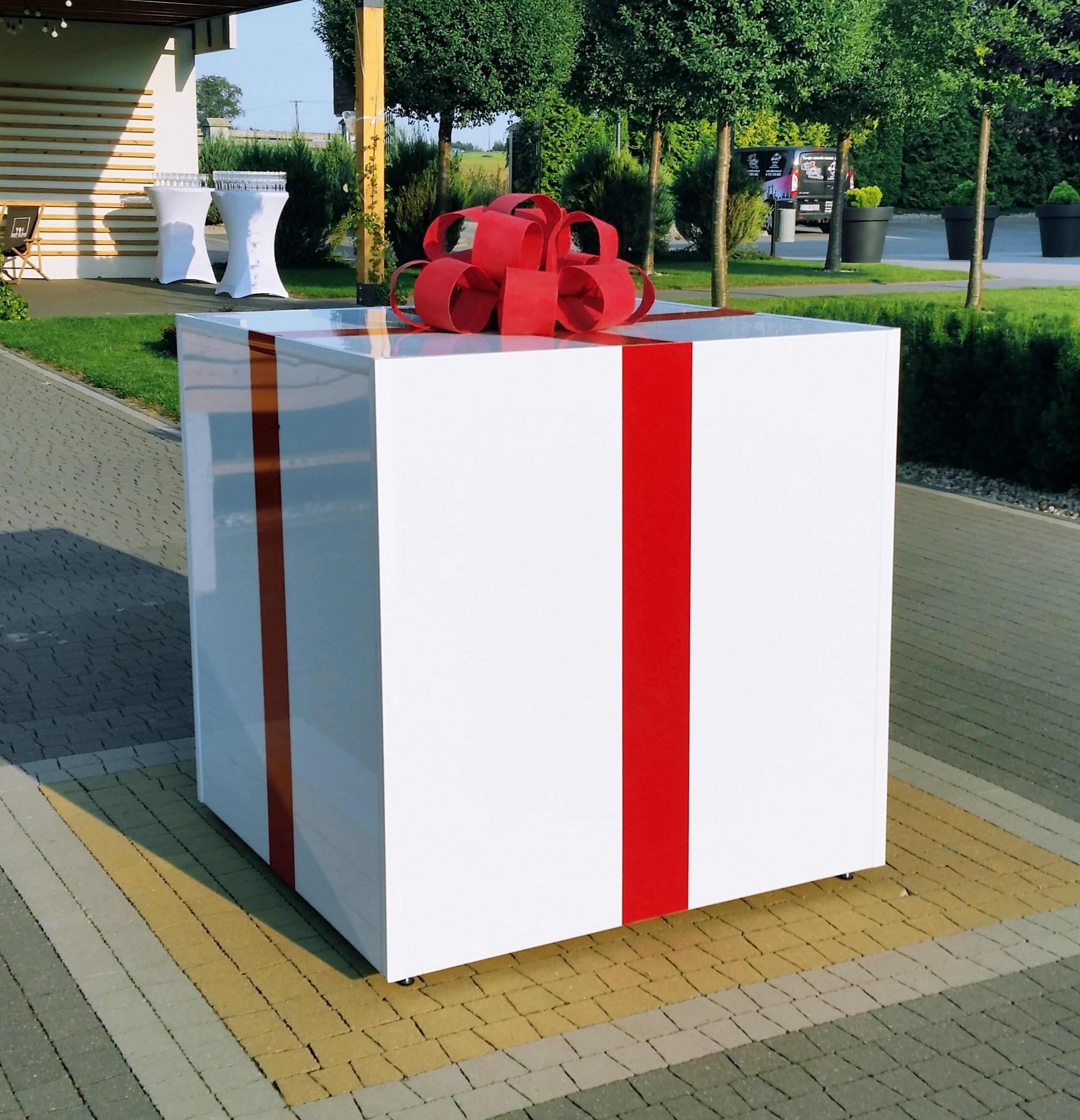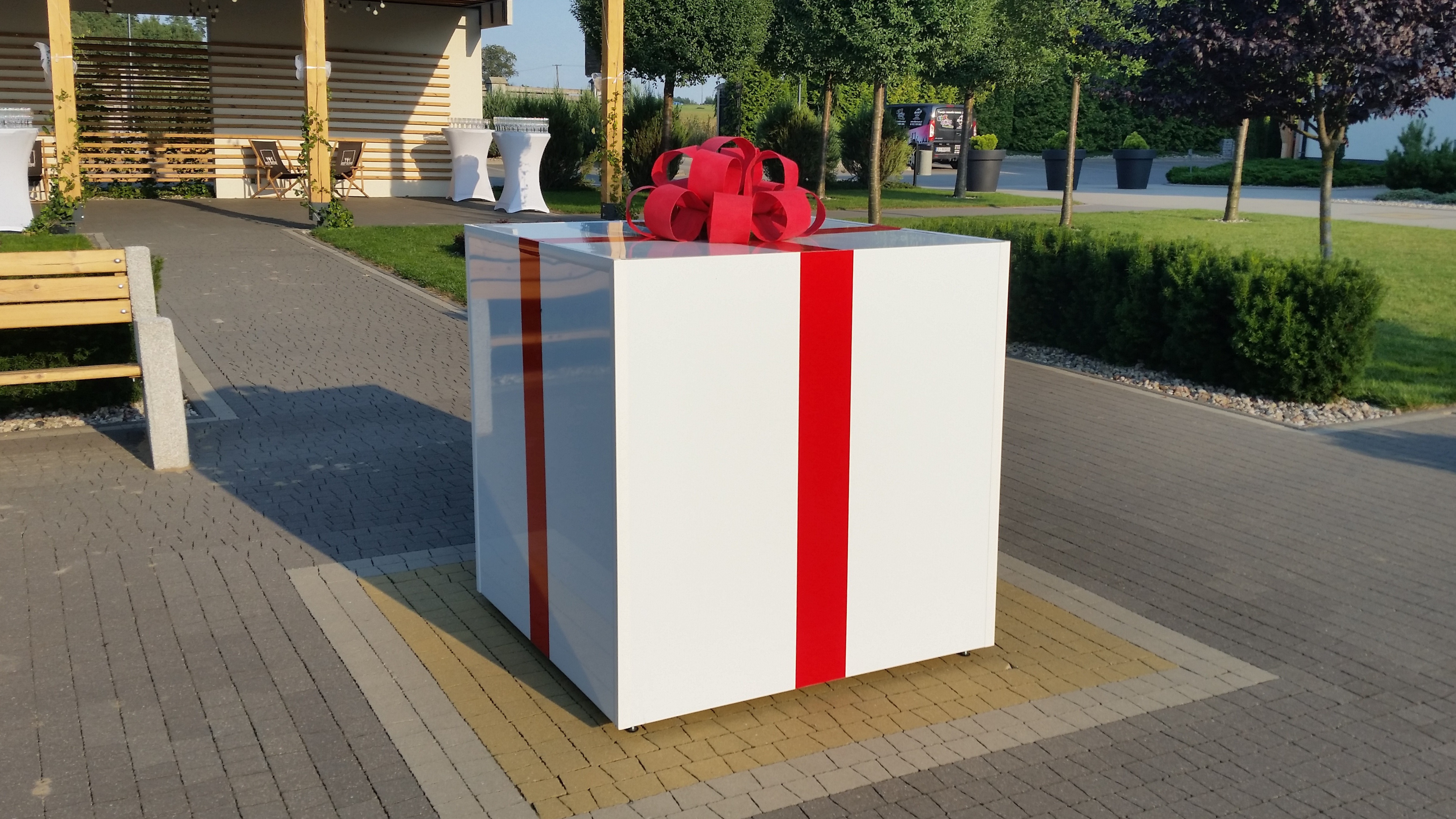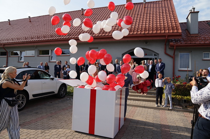 Pudło "PREZENT" z balonami z helem. Jest to piękna atrakcja urozmaicająca wyjście pary młodej z kościoła czy wejście na salę weselną. Pudło niespodzianka może być także atrakcją takich imprez jak urodziny, chrzest, różnice, otwarcie sklepu itp. Jest to wspaniały prezent od rodziców, rodzeństwa, świadków, chrzestnych itp. W pudle mieści się ok. 100 sztuk balonów.