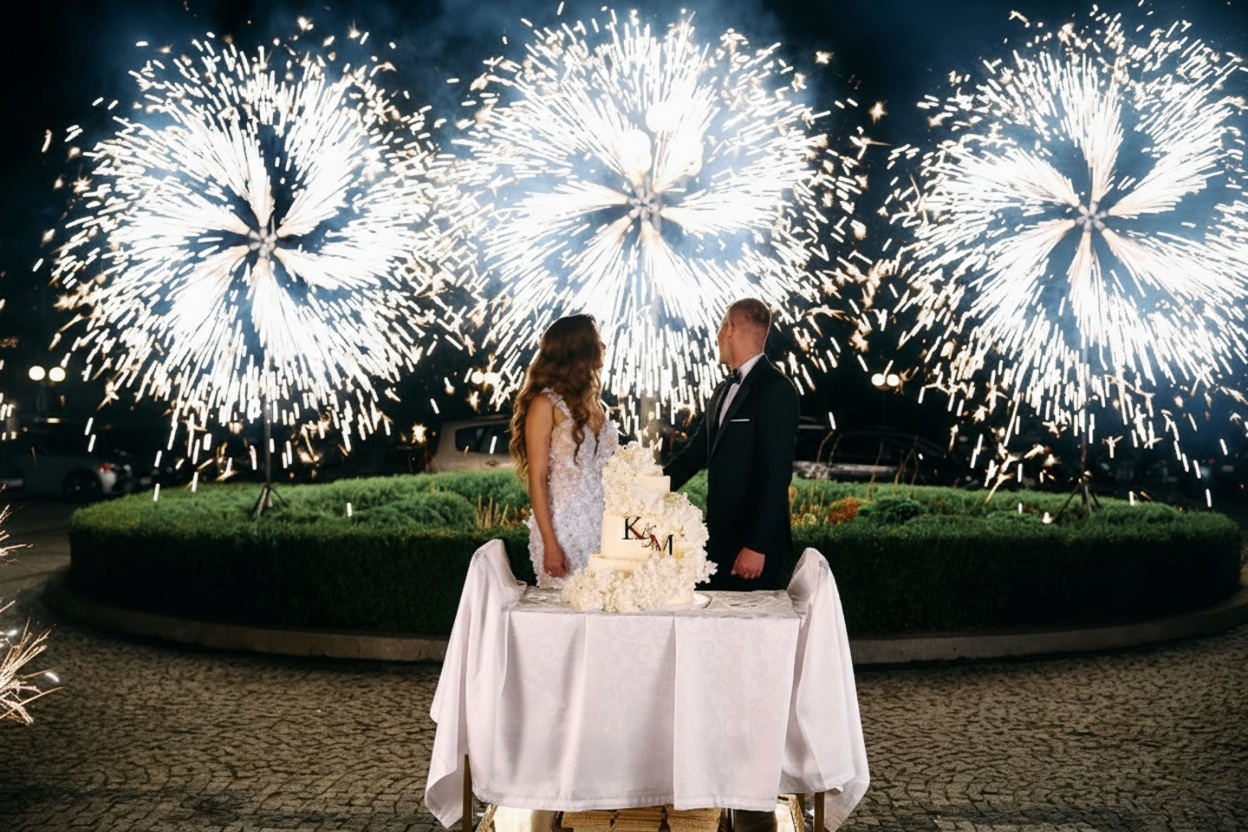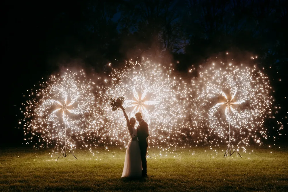 Czy może być coś bardziej urokliwego niż wirujące po nocnym niebie wiatraki iskier? Nasze wiatraki iskier nadadzą blasku każdej uroczystości weselnej. Idealnie sprawdzą się jako tło przy krojeniu tortu. Wprawią w zachwyt Waszych gości weselnych.